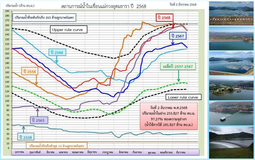 สำหรับสถานการณ์น้ำในอ่างเก็บน้ำเขื่อนแม่กวงอุดมธารา ปัจจุบันมีปริมาณน้ำกักเก็บอยู่ที่ 255.827 ล้าน ลบ.ม. คิดเป็น 97.27% ของความจุ โดยมีปริมาณน้ำใช้การได้อยู่ราว 241.827 ล้าน ลบ.ม. โดยที่ยังมีปริมาณที่ไหลเข้าอ่างเก็บน้ำเขื่อนแม่กวงฯ และแนวโน้มปริมาณน้ำในเขื่อนยังอยู่ในทิศทางที่เพิ่มขึ้น โดยที่ปริมาณน้ำขณะนี้มีมากกว่าปี 2567 ราว 16.97%