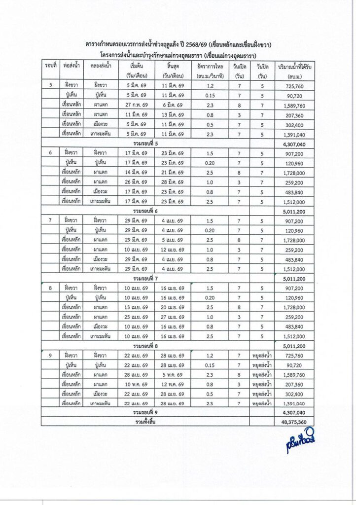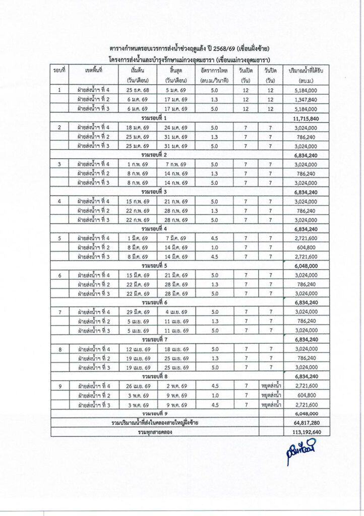 ทั้งนี้แผนการจัดสรรน้ำของเขื่อนแม่กวงอุดมธาราในช่วงฤดูแล้งปี 2568/69 โครงการฯ กำหนดความสำคัญให้กับน้ำเพื่อการอุปโภค-บริโภคเป็นอันดับแรก น้ำเพื่อรักษาระบบนิเวศน์และการท่องเที่ยว น้ำเพื่อการเกษตร และน้ำเพื่ออุตสาหกรรม ตามลำดับ โดยส่งน้ำเพื่อการอุปโภค-บริโภค ราว 6.040 ล้าน ลบ.ม. เป็นแผนส่งน้ำช่วงวันที่ 1 ธ.ค. 2568 ถึงวันที่ 30 เม.ย.2569 และมีแผนส่งน้ำเพื่อการเกษตรราว 110.538 ล้าน ลบ.ม. โดยกำหนดส่งน้ำตั้งแต่วันที่ 25 ธันวาคม 2568 ถึงวันที่ 6 พฤษภาคม 2569 สำหรับพื้นที่เพาะปลูก 91,852 ไร่ แยกเป็น นาข้าว 54,120 ไร่ ไม้ผล 32,066 ไร่ พืชไร่-พืชผัก 2,910 ไร่ และบ่อปลา 2,756 ไร่