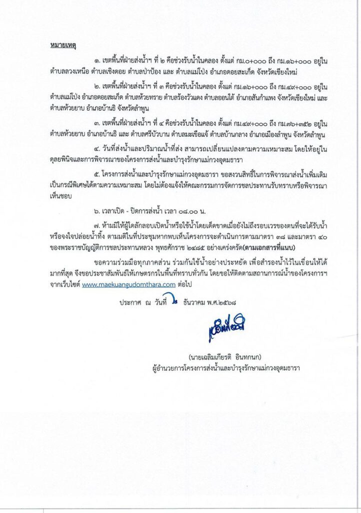 ในส่วนของเวทีการประชุม ที่ประชุมเปิดโอกาสให้ทุกฝ่าย รวมถึงผู้ใช้น้ำในพื้นที่บริการของคลองส่งน้ำสายต่างๆ ได้แสดงความเห็นกันอย่างเต็มที่ โดยมีมติวางแผนให้ส่งน้ำแบบรอบเวรโดยรอบแรกเริ่มในวันที่ 25 ธันวาคม 2568 (คลองส่งน้ำสายใหญ่ฝั่งซ้าย เริ่มส่งรอบแรกวันที่ 25 ธันวาคม 2568 คลองส่งน้ำสายใหญ่ฝั่งขวา เริ่มส่งรอบแรกวันที่ 5 มกราคม 2569 คลองส่งน้ำ Main Dam เริ่มส่งรอบแรกวันที่ 5 มกราคม 2569 ) โดยกลุ่มผู้ใช้น้ำต้องร่วมกันขุดลอกคลองและกำจัดวัชพืชก่อนส่งน้ำตามกำหนด โดยเรื่องใหม่สำหรับการส่งน้ำช่วงแล้ง 68/69 คือ การส่งน้ำเขื่อนฝั่งซ้าย ที่มีมติส่งให้ตอนท้ายสุดของคลองก่อน โดยส่งให้พื้นที่ฝ่ายส่งน้ำและบำรุงรักษาที่ 4 ซึ่งเป็นพื้นที่ใน จ.ลำพูน ได้ใช้ก่อน โดยกำหนดส่งให้ในวันที่ 25 ธ.ค. 68 ถึง 5 ม.ค. 69 จากนั้นส่งให้ตอนต้นๆ คลองได้ใช้ คือ พื้นที่ฝ่ายส่งน้ำและบำรุงรักษาที่ 2 และ 3 ส่งในวันที่ 6 – 17 ม.ค. 69 และมีมติร่วมกันด้วยว่า ช่วงส่งน้ำให้พื้นที่ฝ่ายส่งน้ำและบำรุงรักษาที่ 4 ตอนต้นห้ามลักลอบใช้น้ำโดยเด็ดขาด หากฝ่าฝืนจะดำเนินการตามพระราชบัญญัติการชลประทานหลวง พ.ศ.2485