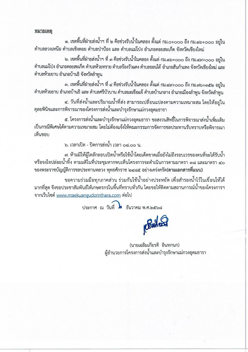 ทั้งนี้ นายเฉลิมเกียรติ อินทกนก ผู้อำนวยการโครงการส่งน้ำและบำรุงรักษาแม่กวงอุดมธารา ได้มอบหมายให้หัวหน้าฝ่ายส่งน้ำและบำรุงรักษาที่ 1 – 4 ลงพื้นที่ประชาสัมพันธ์ให้เกษตรกรในพื้นที่ได้รับทราบเกี่ยวกับแผนการบริหารจัดการน้ำฤดูแล้ง ปี พ.ศ. 2568/69 และมาตราบริหารจัดการป้องกันและแก้ไขปัญหาฝุ่นละอองขนาดเล็ก ไม่เกิน 2.5 ไมครอน(PM 2.5)ภาคการเกษตร ของประกาศกระทรวงเกษตรและสหกรณ์อย่างทั่งถึง โดยขอให้ปฏิบัติตามกฎ ระเบียบ ข้อบังคับ และมติที่ประชุมเห็นชอบตามแผนการส่งน้ำที่กำหนดไว้